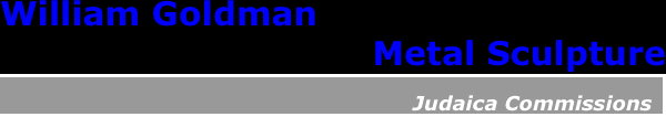 Stainless Steel Wall Sculpture by William Goldman . Commissioned by Congregation Beth Am, Buffalo Grove, IL The sculpture depicts a Mopgen David of individual parts and at the same time star of unity, representing both indvidual families and one unified congregational family. The size of the elements, each coming from within the other, suggests a generational progression moving outward into the future. A feeling of movement and high energy are created through the shapes, arrangement of elements and the swirling textured surfaces. (Size: 70"w X 70" h X 15" d) | ||